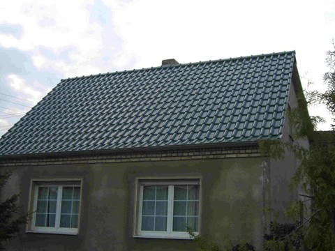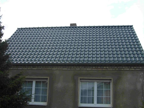 Dachsanierung mit Braas ® Ziegeln , Flachdachpfanne Rubin 13, Farbe Kiefer.